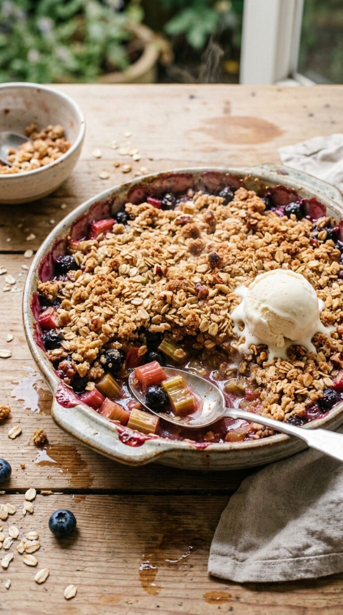 A crisp of cups rhubarb and two blueberries with sugar, topped with a crumble of flour, oats, brown sugar, butter, cinnamon, and nuts. Served warm with ice cream.