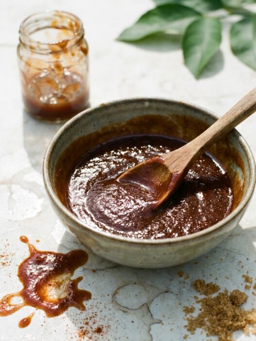 Homemade barbecue sauce from Southern Living, adapted with ketchup, brown sugar, honey, vinegar, smoked paprika, and cayenne. Simmered twenty minutes until thick.