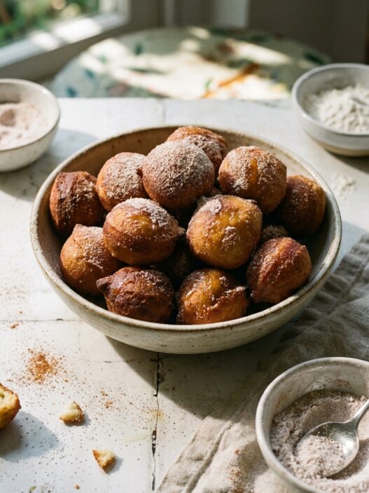 Yeasted doughnut holes made with butter, milk, and eggs. The dough rises for an hour, then gets pinched into balls, deep fried, and rolled in cinnamon powdered sugar.