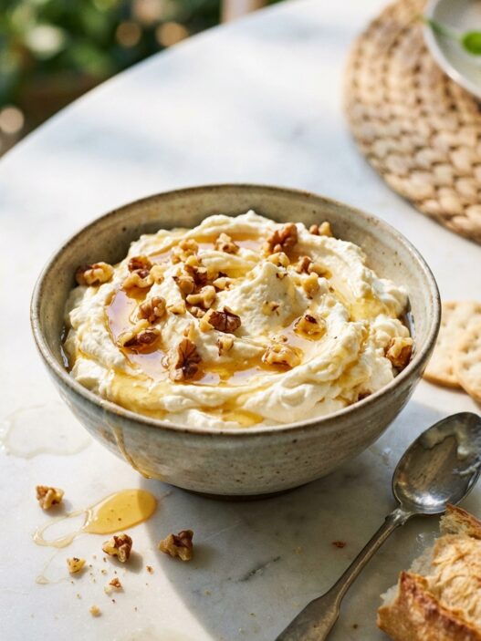 Mascarpone and goat cheese beaten fluffy with honey and olive oil, piled with toasted walnuts and drizzled with more honey. Ten minutes, no cooking beyond the nuts.