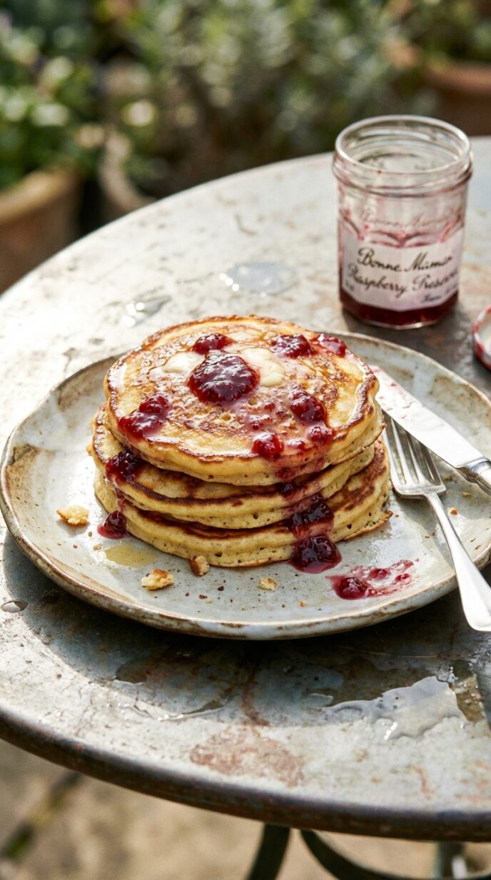 Pancakes made with Greek yoghurt, Meyer lemon juice and zest, and served with raspberry preserves. Tangy, citrusy, and fluffy. Spring breakfast on a plate.