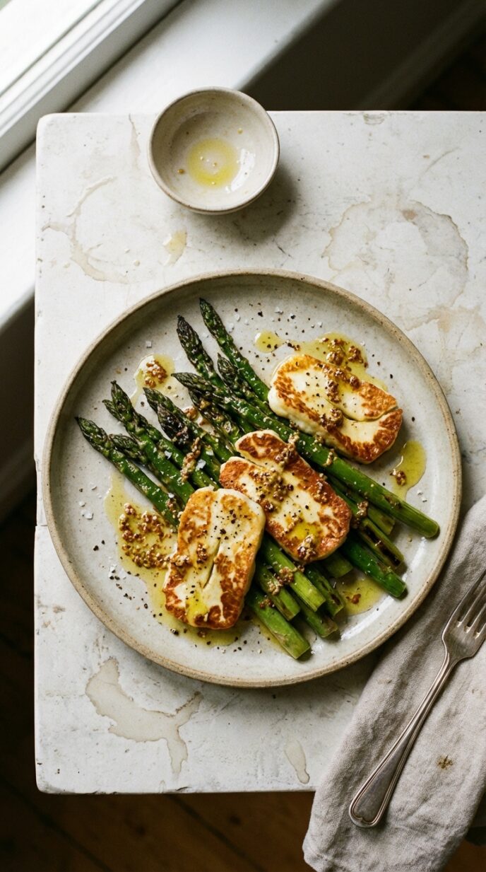 Grilled asparagus and thick-sliced haloumi with a simple mustard and olive oil dressing. The cheese grills golden and firm, the asparagus snaps with char.