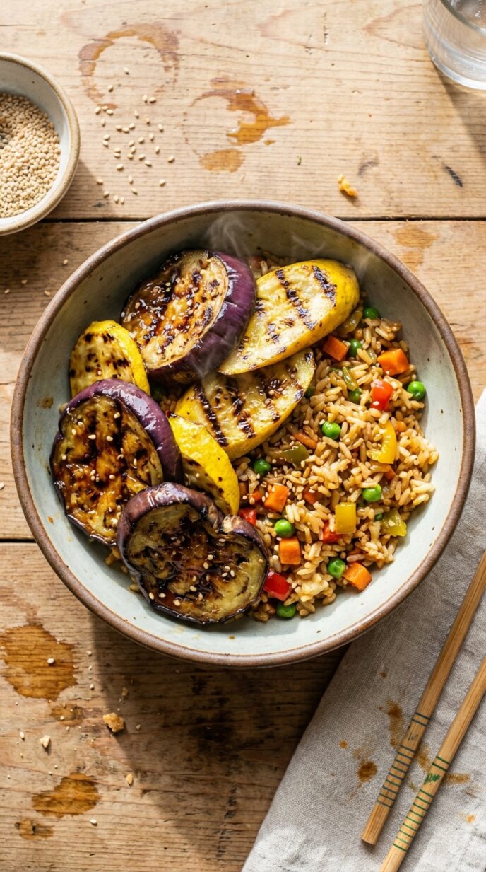 Grilled eggplant and yellow zucchini marinated in coconut aminos, sesame oil, ginger, and garlic. Served with vegetable fried rice. A full plant-based plate.