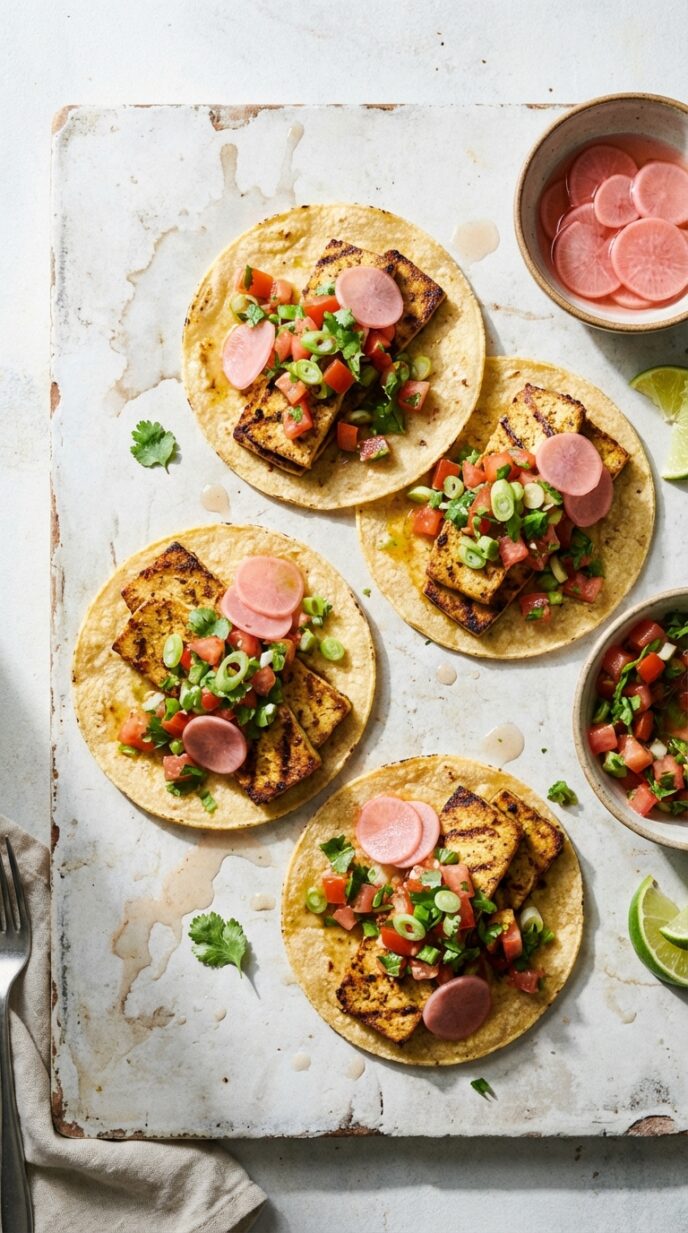 Grilled tofu tacos with cumin-marinated tofu, fresh pico de gallo of tomatoes, scallions, lime, and cilantro, and quick-pickled radishes in apple cider vinegar.