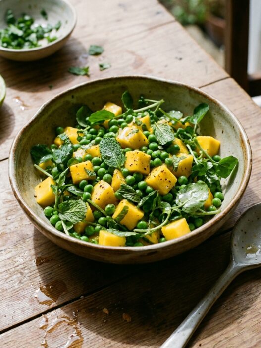 Mango, mint, and pea salad with watercress, dressed with lime juice, salt, and pepper. No oil, no cooking. Sweet mango, crunchy peas, cool mint, and peppery greens.