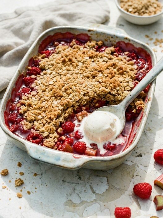 A crisp of sliced rhubarb and fresh raspberries with sugar, cornstarch, and vanilla, topped with a crumble of oats, brown sugar, cinnamon, and melted butter. Baked until golden and bubbling.
