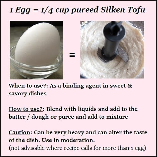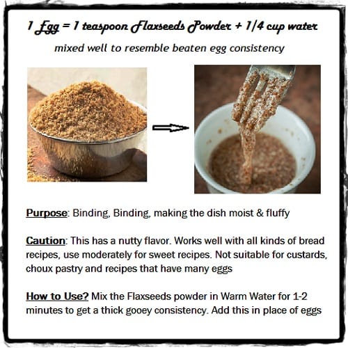 You can usually find tons of tested “eggless” recipes on the internet. However, if you are particular about substituting for eggs in a particular recipe, please understand the reason for using eggs in that recipe and replace accordingly!