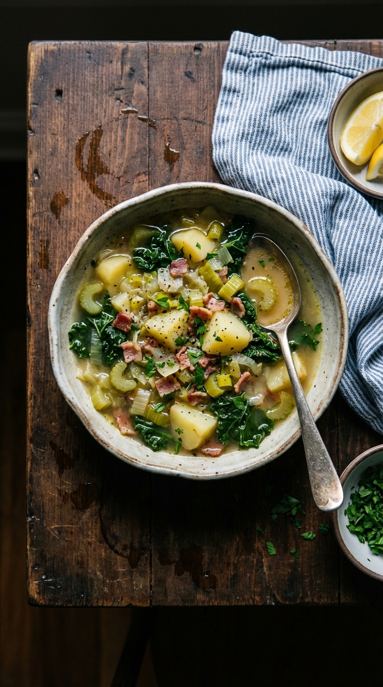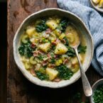 A cozy pot of leeks, potatoes, and kale simmered in stock with a Parmesan rind and a little bacon for depth.