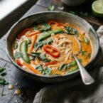 A pot of vegetarian Coconut Noodle Soup can be prepared in just 20 minutes, and that makes for a perfect weeknight dinner. Cozy as can be!