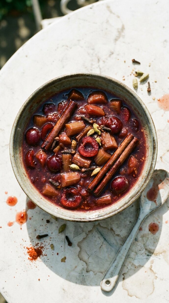 Rhubarb and Bing cherry chutney with dry-roasted cardamom, cloves, Kashmiri chili, and cinnamon. Simmered thick, jarred, and deeply spiced.