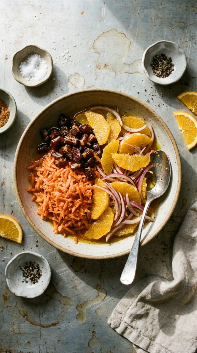 A Moroccan salad of grated carrots, Medjool dates, orange slices, and red onion dressed with olive oil, lemon, orange juice, cumin, cinnamon, and garlic. Sits two hours to develop.
