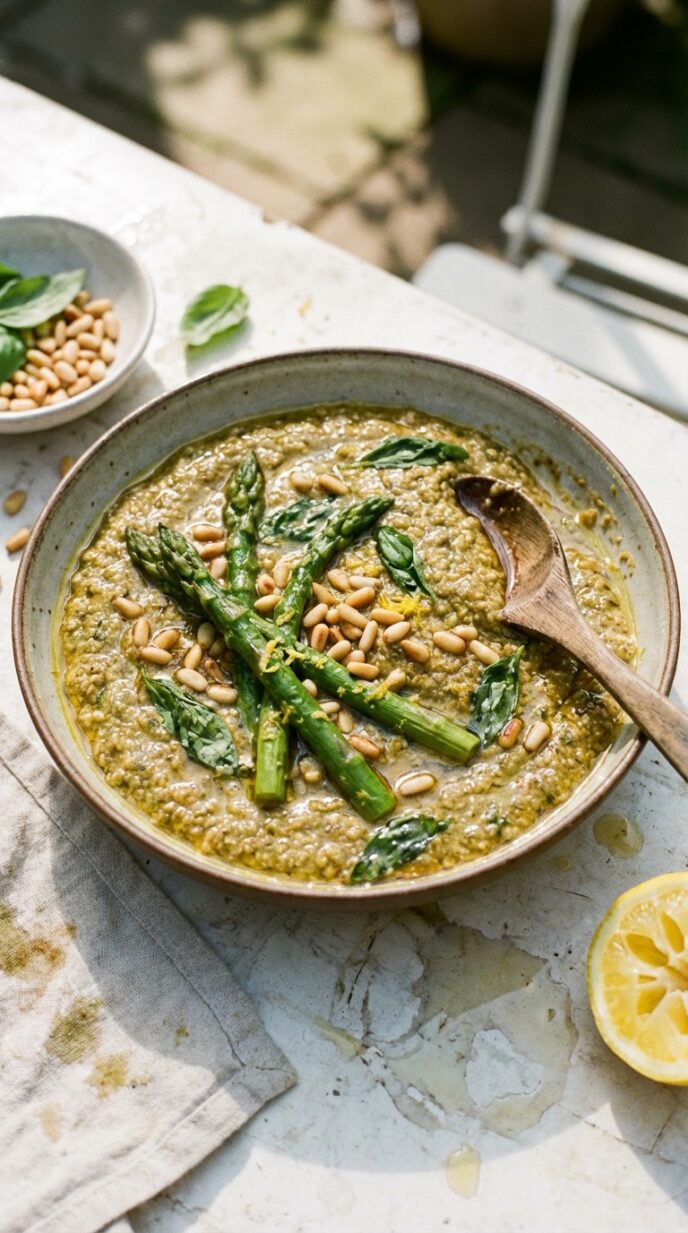 Asparagus pesto made by blending boiled asparagus with toasted pine nuts, lemon zest, garlic, basil, olive oil, and Parmesan. Lighter and more springy than traditional pesto.