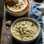 - Ladle some chowder into each bread roll bowl, garnish with parsley, and serve with the bread roll lids for dipping.