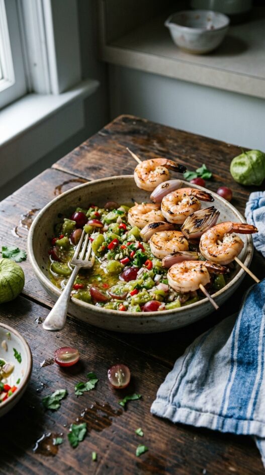 Grilled shrimp meet a vibrant tomatillo salsa with grapes and a hint of brandy. A zesty appetizer with a sophisticated kick.