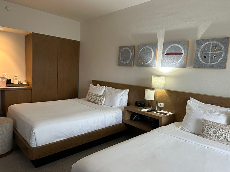 My double queen room looked out onto green lawns and walking paths. Each morning, I stepped outside to dry, fragrant air and wide desert views. Inside, there were earth colors, soft fabrics, cozy white robes (which you could wear anywhere and people did), nice bath products, a coffee and tea maker, a small fridge, and a safe.