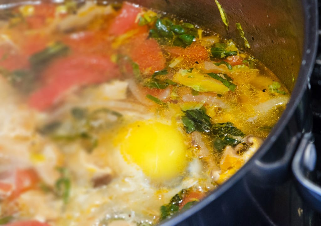 Here’s the version I created, flavored with what I had on hand. I chose to include the onion, rather than serve it on the side. I served it over duck eggs that I poached in the soup itself.