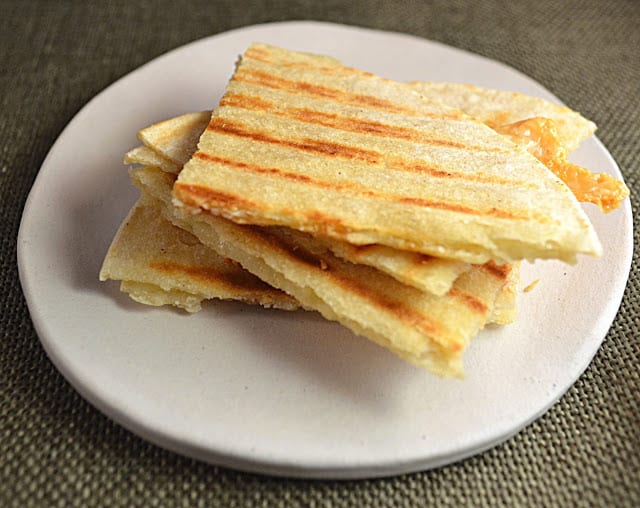 - Spray tortillas with a little cooking spray. Put 1-2 slices of cheese of your choice between to two corn tortillas. Don’t over do it with the cheese. I tried this with light cheddar and it didn’t work too well. It made a mess in my panini press. The cheese oozed everywhere. So I suggest using full-fat cheese. I like aged cheddar or jack cheese or a Mexican shredded blend. Cook the tortillas in a panini press until the cheese is melted and the tortillas are somewhat crisp and browned. Alternatively, you can make them in a cast iron skillet. Cut into wedges and serve with the black bean salsa, lite sour cream, avocado slices and limes.