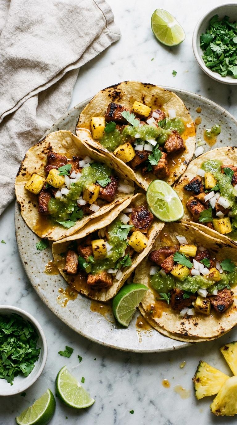 Serve on doubled-up corn tortillas topped with the diced charred pineapple, white onion, fresh cilantro, a squeeze of lime, and salsa verde. Doubling the tortillas is non-negotiable. A single tortilla will tear under the weight of the meat, and the two layers give you a sturdier vehicle for all those toppings.