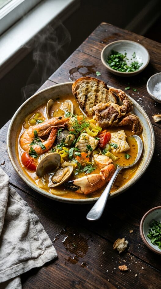 Ladle seafood and broth into 4 wide bowls. Top each with a grilled sourdough slice (and a fried soft-shell crab, if you’re going all in). Serve immediately.