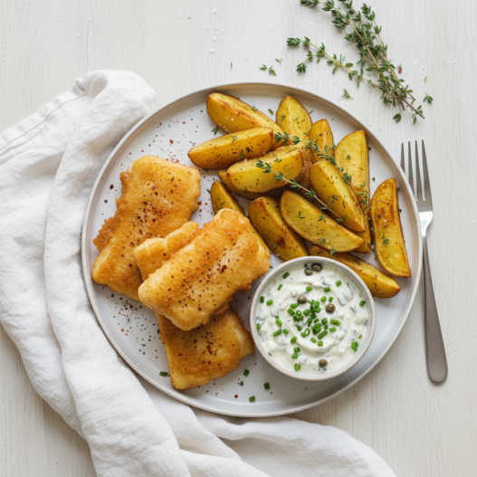 These fish and chips are baked in a beerbatter which gives it a lovely crispy outside layer. Delicious with a homemade tartar sauce.