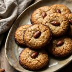 - Place the mixture into a piping bag and make round shapes on a silicone mat if you have it, or parchment paper over a baking sheet. Place one almond in the center of each cookie.