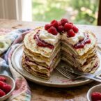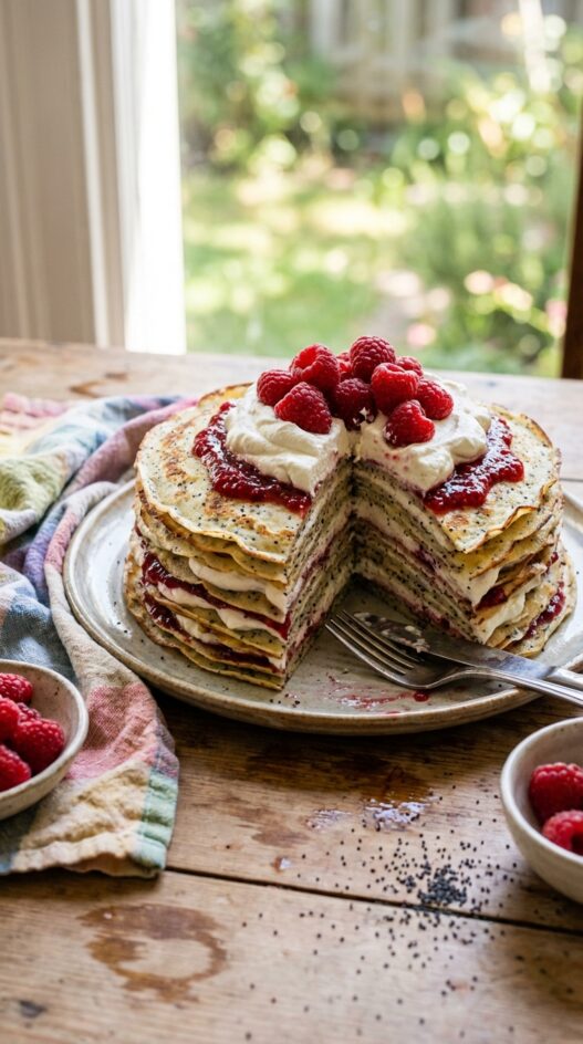 Delicate almond poppyseed crêpes layered with creamy almond whipped cream and raspberry jam. Perfect for a special breakfast or any celebration!