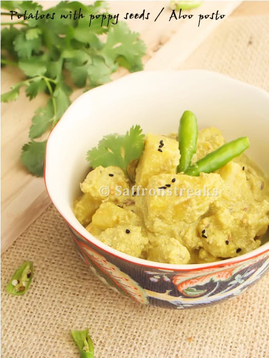 We present today the classic “Aloo posto” without which any Bengali lunch seems unfinished. Posto (poppy seeds) is essential to Bengali household, no matter how much its price skyrocketed, and besides liberally being used in veg dishes, many Bengali fish recipes and chicken or mutton dishes also use posto in the recipes. And to me the best one is posto fritters with onions, which is meant to be eaten with steamed rice with a dollop of ghee!