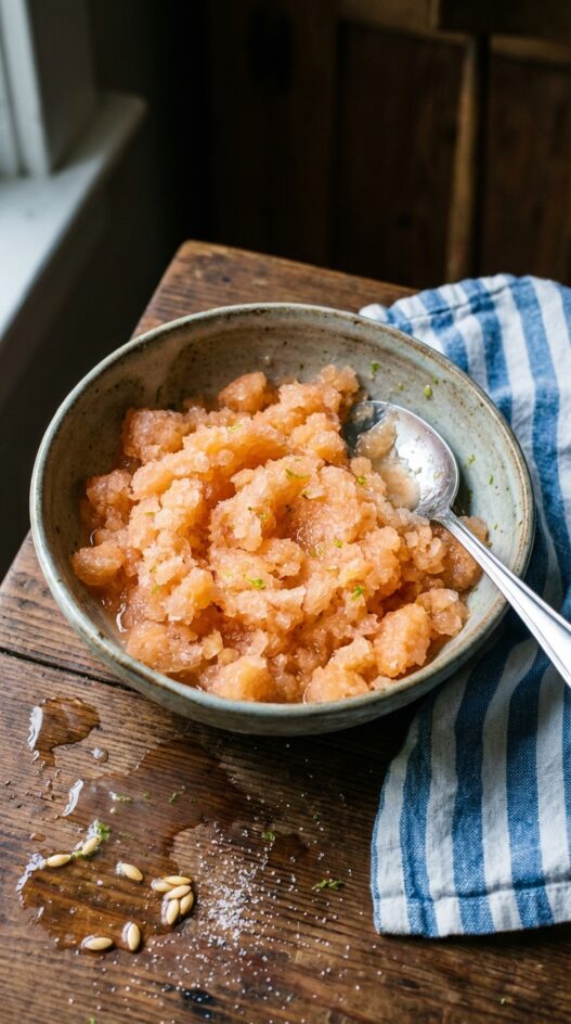 Granita is the honest version of sorbet: no machine, no churning required, and a fork does the whole job. Cantaloupe is a strong choice for it because ripe melon is sweet enough that the simple syrup barely needs to do anything, and the flavor holds up once frozen in a way that more delicate fruits don’t. Simple enough. Lime juice cuts through the sweetness and a pinch of salt amplifies everything. The forking step matters; do it at the one-hour mark and again at two hours, otherwise you end up with a solid block rather than the loose, icy texture that makes granita what it is. Takes about ten minutes of actual effort spread across two hours, and it’s far better than anything out of a bag.