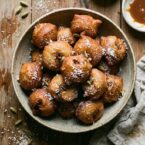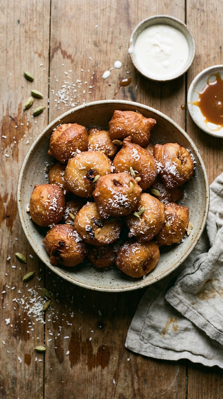 - Heat oil for frying in a deep pan. Drop scoops of batter into the hot oil using a mini ice cream scoop, turning occasionally until golden brown. Drain on kitchen towels and sprinkle with powdered sugar or coconut flakes.
