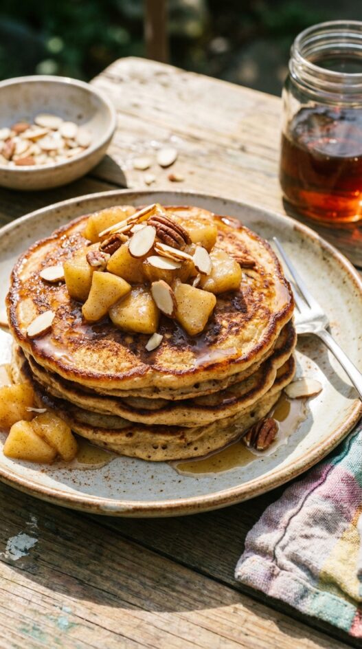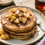 Fluffy pancakes with warm apple pie spice and a delicious apple topping. Perfect for a cozy weekend brunch!
