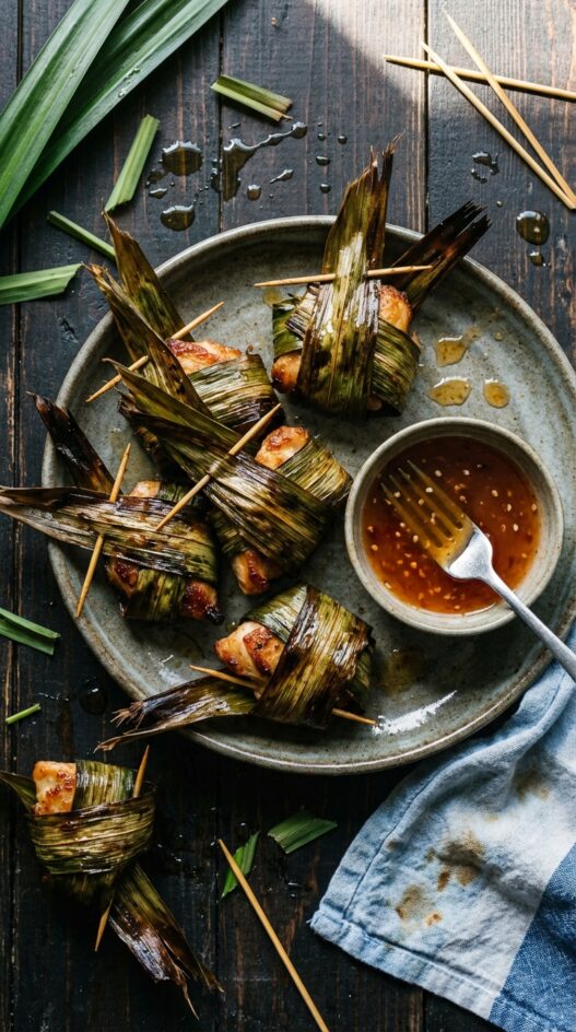 Pandan chicken is a Thai appetizer where marinated chicken pieces are wrapped in pandan leaves before frying or baking. The leaves release a sweet, floral aroma during cooking that infuses directly into the meat.