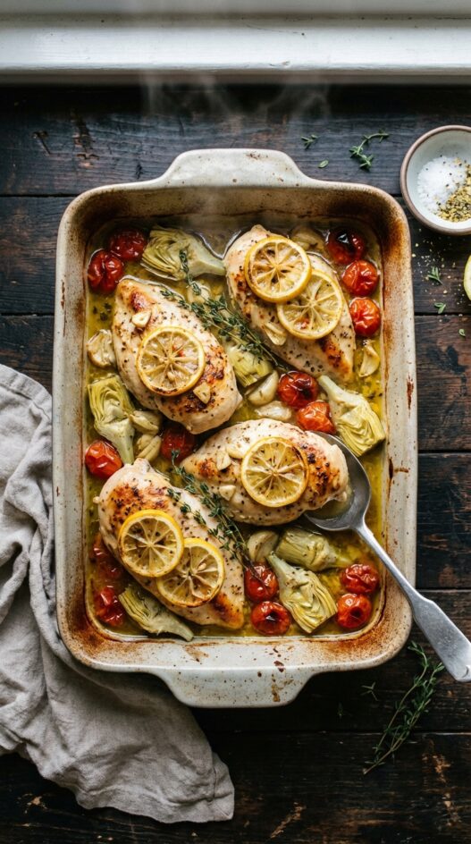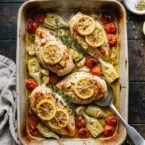 Bright lemon flavors mingle with tender chicken, garlic, artichokes, and cherry tomatoes in this quick and easy oven-baked dish. Perfect for a weeknight meal!