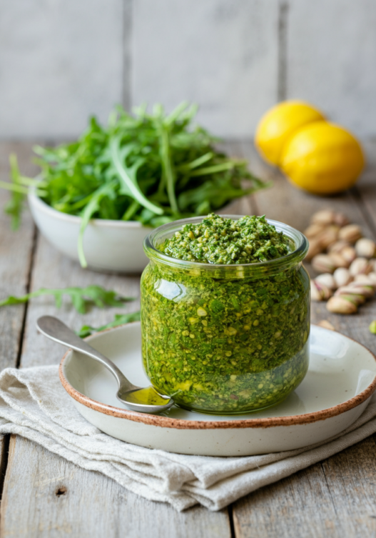 This arugula pistachio pesto is a flavorful twist on the classic, combining peppery arugula, creamy Pecorino Romano, and crunchy pistachios with a splash of lemon juice for a vibrant sauce.