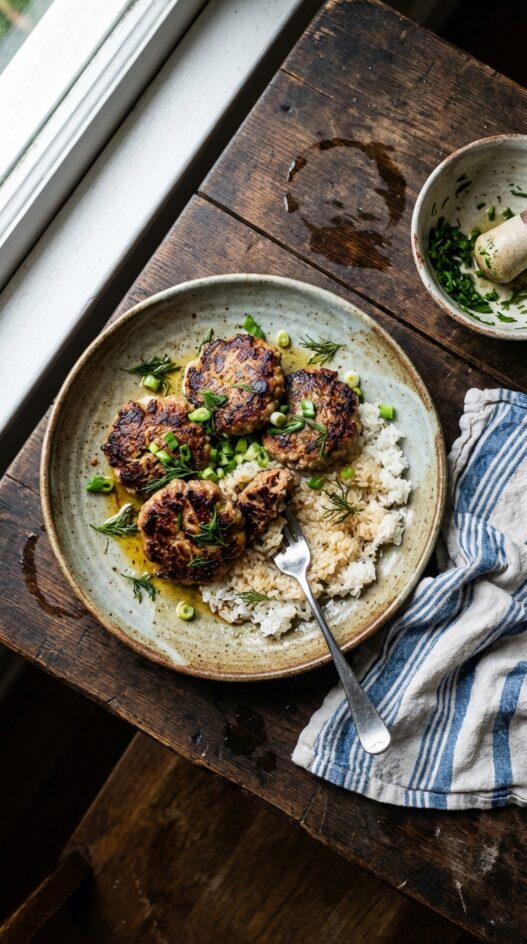 Flavorful beef patties seasoned with Asian spices, served with fluffy sticky rice. A delicious and satisfying meal.