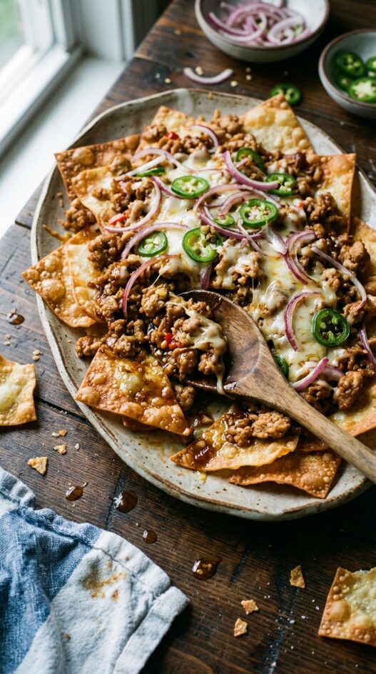 Crispy wonton chips layered with flavorful Asian-spiced chicken, cheese, and veggies. Topped with a spicy peanut sauce for an unforgettable twist on nachos!