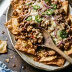 Crispy wonton chips layered with flavorful Asian-spiced chicken, cheese, and veggies. Topped with a spicy peanut sauce for an unforgettable twist on nachos!