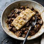 A fishing trip to the Pacific Northwest years ago left me with more turbot than I knew what to do with. A friend suggested ginger, soy, and sesame. Simple enough to feel like cheating. The mushrooms cook down into a savory base and the fish goes in on top, soaking up the broth as it bakes. No fussy technique required. Fifteen minutes and it’s done.