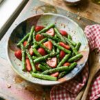 Thin to medium asparagus spears work best here since they’re more tender and have a better ratio with the strawberries. Thicker spears can be shaved with a peeler for a lighter texture.