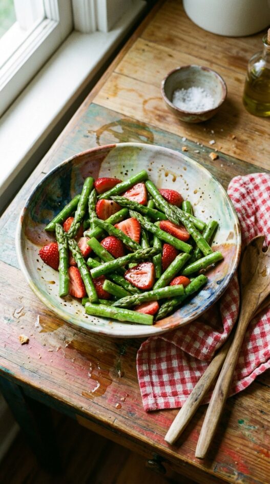 Sweet and tangy spring salad with asparagus and strawberries. Perfect alongside crusty bread and cheese.