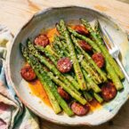 Spanish chorizo here means the firm, cured variety rather than the raw Mexican-style sausage, which matters for both texture and flavor. The chorizo goes in before the asparagus, which gets time to brown on both sides, so it warms through and releases its fat into the pan without overcooking. A generous sprinkle of large granule sea salt at the end makes it even better. Serve immediately, directly from the skillet, with good bread nearby to soak up the oil left in the pan.