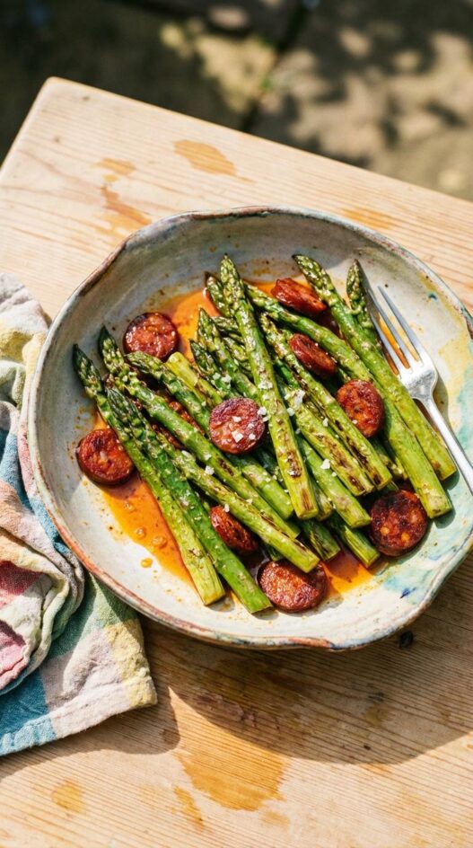 Spring asparagus and Spanish chorizo is a classic pairing built on contrast: the green, slightly grassy flavor of fresh asparagus against the smoky, paprika-heavy fat of cured sausage. This is a four-ingredient recipe and a fast one, well suited to the beginning of asparagus season when the stalks are thin and tender enough to cook quickly in a cast iron skillet. As a tapa or a side dish, it delivers a lot of flavor with very little effort.