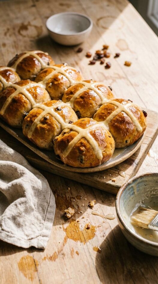 You rub cold butter into the flour by hand, fold in sultanas, and let the dough rise once before shaping. The crosses are just flour and water piped on top. No fuss. Twelve to seventeen buns from one batch, depending on how you portion them, and they take about ninety minutes start to finish.