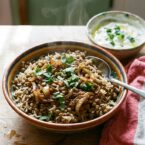 - In a serving bowl, mix the cooked rice, lentils, and caramelized onions. Garnish with chopped coriander. Serve optionally with Greek yogurt mixed with fresh mint and a squeeze of lemon juice.