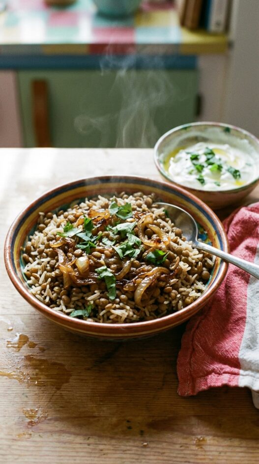 A Middle Eastern classic of lentils and rice, spiced and topped with caramelized onions. Simple ingredients, big flavor!