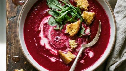 Beet Soup, Spring Greens, and Cornbread Croutons