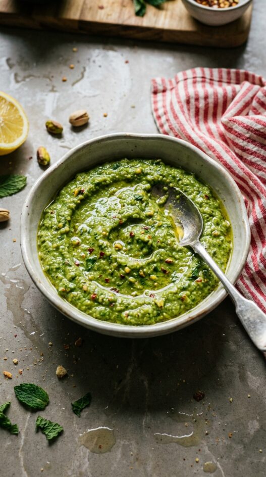 Avocado pesto divides people: some think it’s gimmicky, others use it on everything for two weeks and then move on. This version earns its place because the mint and pistachio give it enough structure to not taste like guacamole-adjacent pasta sauce. The lemon zest matters more than the juice here; it keeps the color bright and adds a sharpness the avocado needs. Use it fast because avocado oxidizes, and no amount of lemon fully stops that past the first hour. On pasta it coats well without needing any pasta water to loosen it. On bread it’s a better option than butter at room temperature. As a dip, pair it with something with crunch.