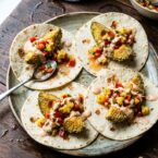 - Spoon salsa onto a tortilla, top with 2 avocado pieces, and drizzle with sauce. Serve immediately.