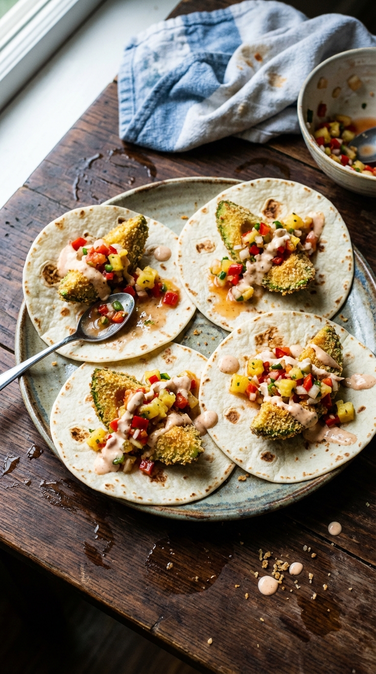 These tacos are best eaten immediately while the avocado is still crispy. The coating softens quickly once it hits the salsa.
