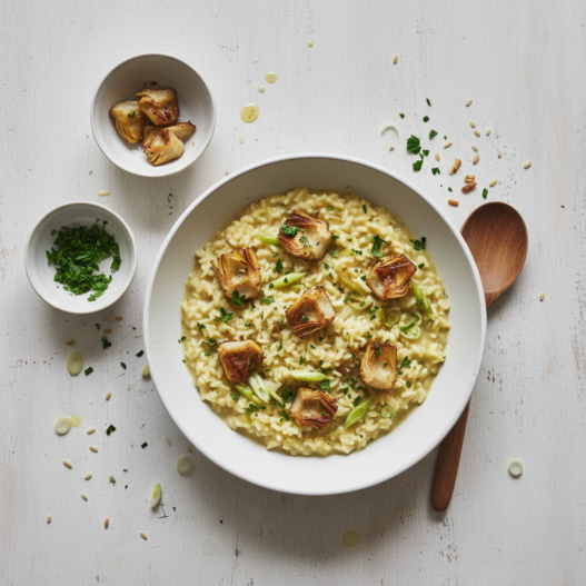 - Serve the risotto in bowls, garnished with finely minced parsley and the fried artichoke hearts.