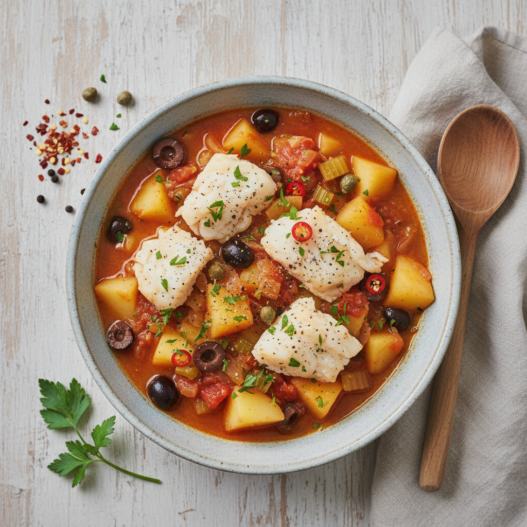 Hearty and flavorful, this baccala stew is perfect for a cozy night in. Potatoes, tomatoes, and olives simmer with salt cod in a rich broth.
